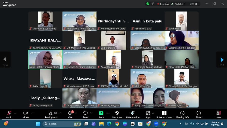 Tim Kerja Keluarga Sejahtera dan Pemberdayaan Keluarga (KSPK) Kemendukbangga/BKKBN Perwakilan BKKBN Provinsi Sulawesi Tengah menggelar Zoom Meeting Monitoring dan Evaluasi (Monev) Program KSPK Tahun 2025 serta Rencana Pelaksanaan Program KSPK Tahun Anggaran 2026, pada Rabu, 4 Februari 2025, pukul 08.00–12.30 WITA.